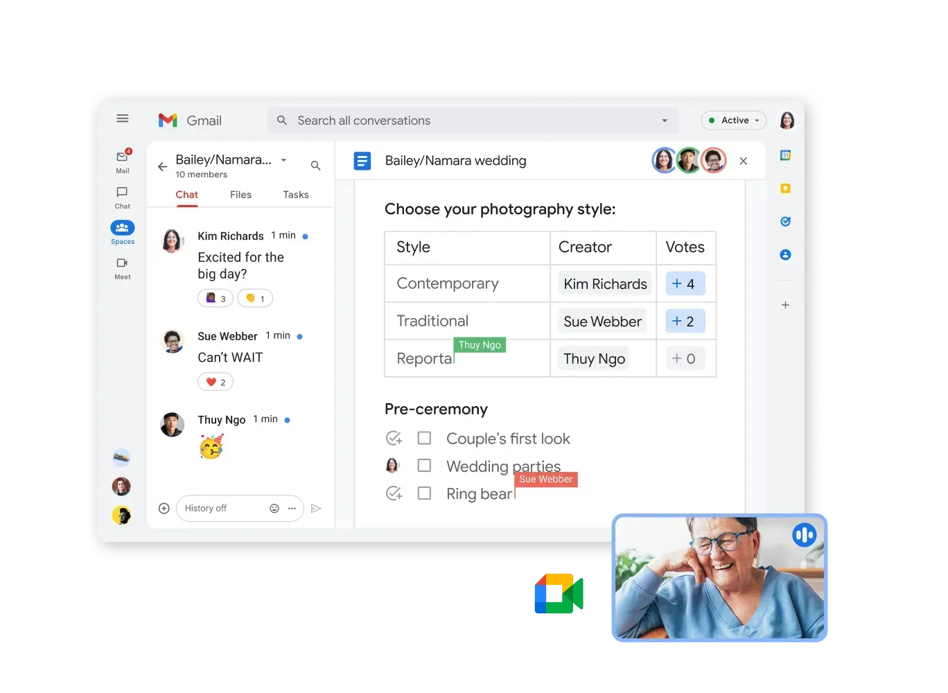 Start a Chat, jump into a video call with Meet, or collaborate in a Doc, all right from Gmail.